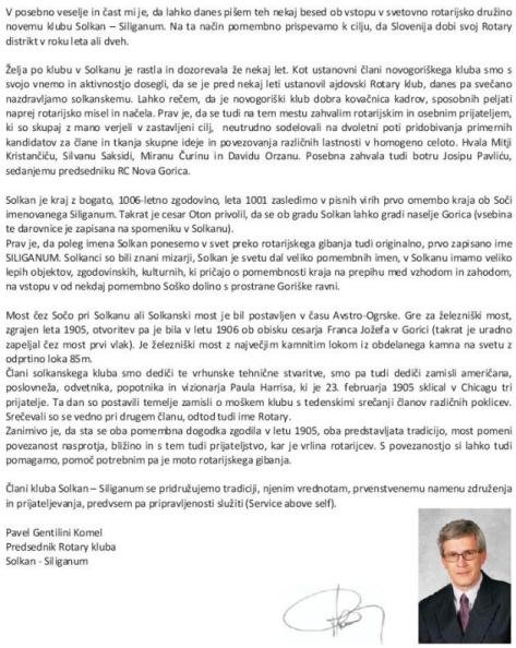 V posebno veselje in čast mi je, da lahko danes pišem teh nekaj besed ob vstopu v svetovno rotarijsko družino novemu klubu Solkan – Siliganum. Na ta način pomembno prispevamo k cilju, da Slovenija dobi svoj Rotary distrikt v roku leta ali dveh.