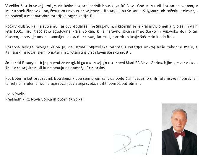 V veliko čast in veselje mi je, da lahko kot predsednik botrskega RC Nova Gorica in tudi kot boter osebno, v imenu vseh članov kluba, čestitam novoustanovljenemu Rotary klubu Solkan – Siliganum ob začetku delovanja na področju mednarodne rotarijske organizacije RI.